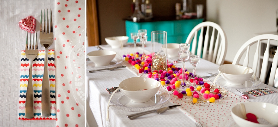I love entertaining and what better excuse then Valentine’s Day :) Mike and I had a couple of our friends over the day after Valentine’s Day for a little get together. I have a lot of fun decorating and had a great time putting together the table decorations for this little party. As I was setting everything up I told Mike that I could totally decorate tables for a living! It’s SO fun. Also, I found almost everything for the table at the Dollar Tree so it was next to nothing to put together… even more fun! Mike responded with the “You can do whatever you want to Hun”. So, he was pretty much telling me that if this whole photography thing stops working out I can decorate tables, right?! I wanted the table to be a fun and relaxed setting that wasn’t over the top with hearts and pink. I am totally NOT a pink and hearts kind of girl! I love the way everything turned out and I can’t wait to have our next party!